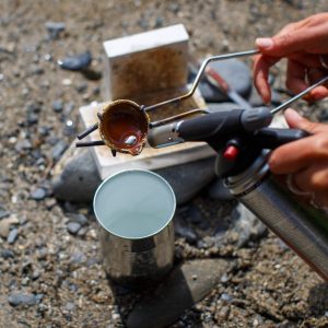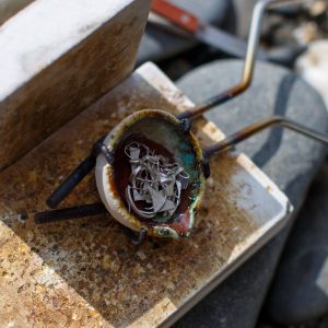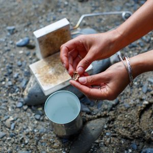 Water casting is an ancient technique, but in the Salt collection, it’s reimagined with a modern, oceanic twist. I collect saltwater from the Atlantic, often during walks along the Cornish shore. The temperature of the water and the way I handle it afterward all affect the final outcome of the silver castings. The silver, too, must be carefully heated to the right temperature, and even small differences in heat can change the way it reacts when it hits the water. The hotter the silver, the more dynamic and fluid the shapes; a higher pour creates dramatic, elongated splashes, while casting closer to the surface results in more compact and intricate designs. Each piece of jewellery is the result of these intricate factors coming together.