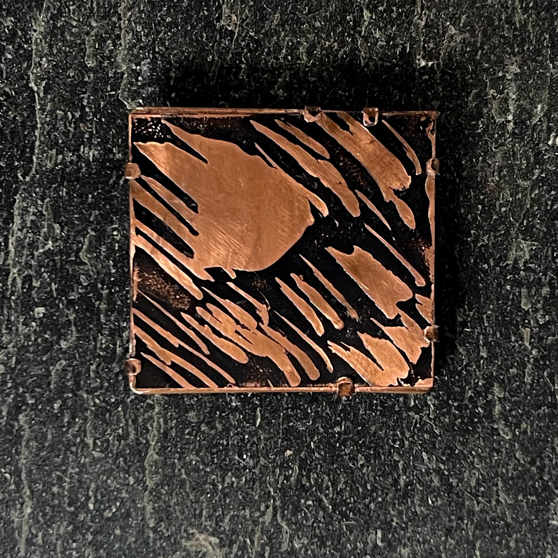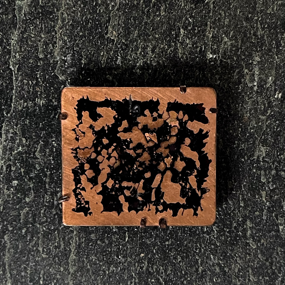 Copper Etched Brooches inspired by textures on the Cornish shoreline. The subtle patina enhances the fine detail, giving depth and contrast to the metal’s warm tones. Each etching is held in a handmade frame with a double attachment on the back to keep the brooch secure. Full of distinctive coastal character.