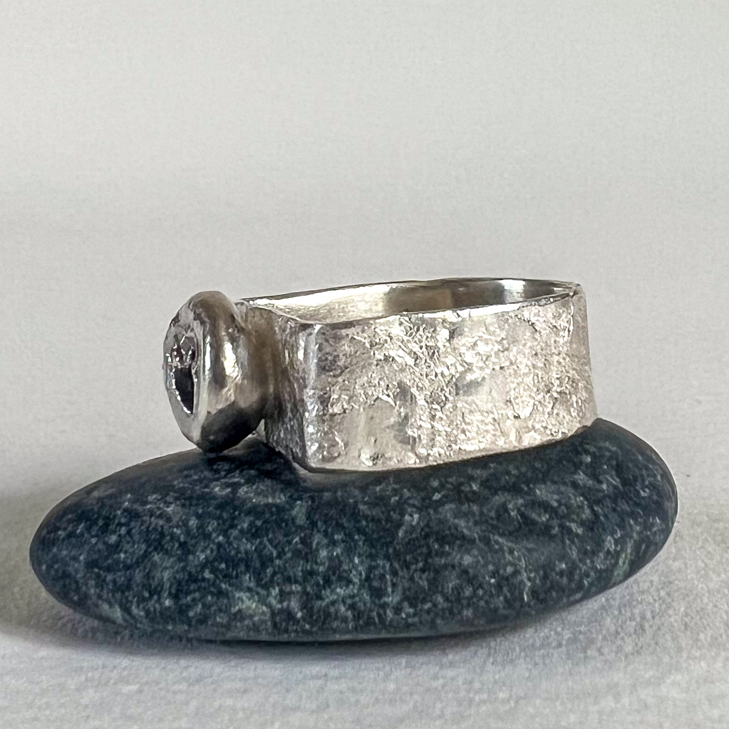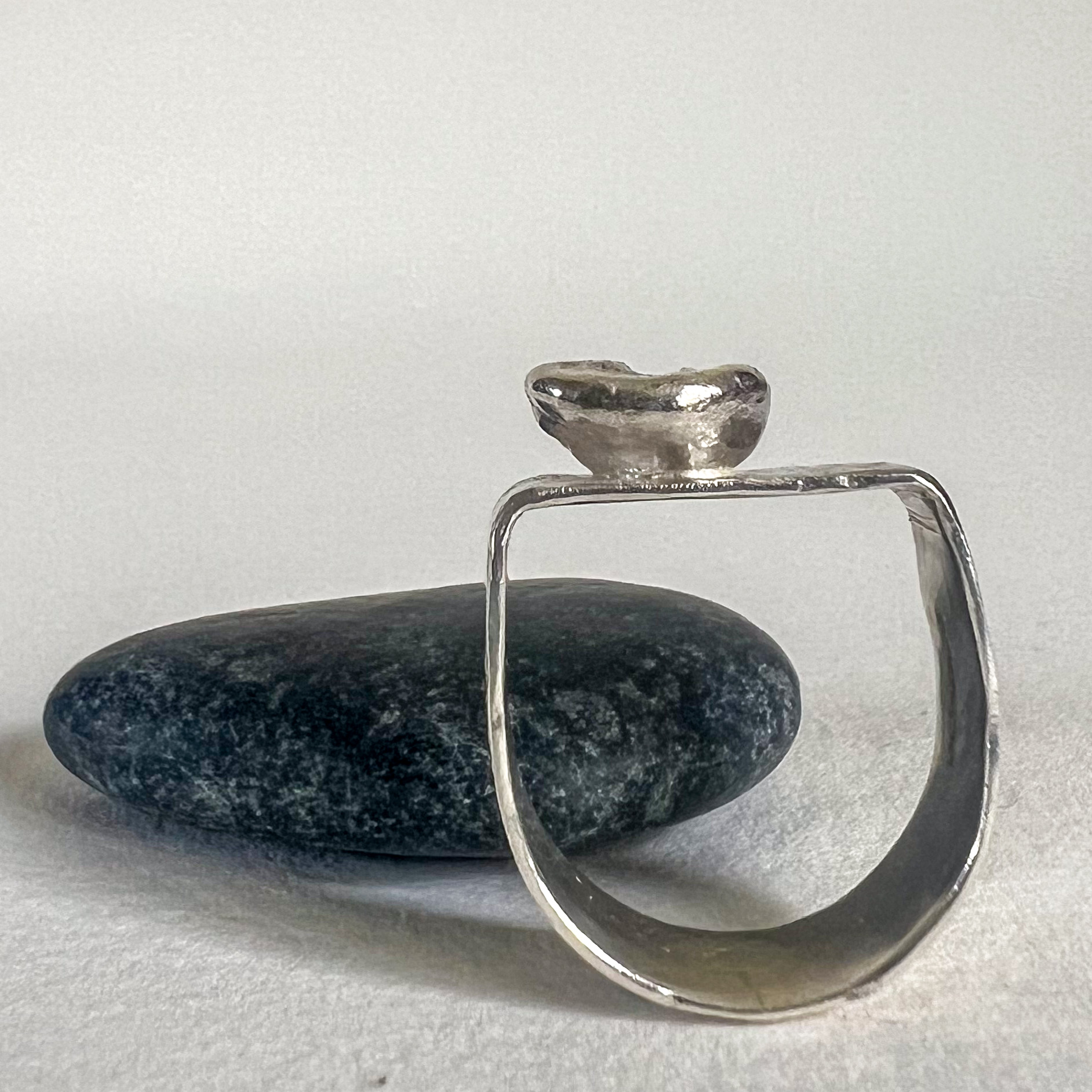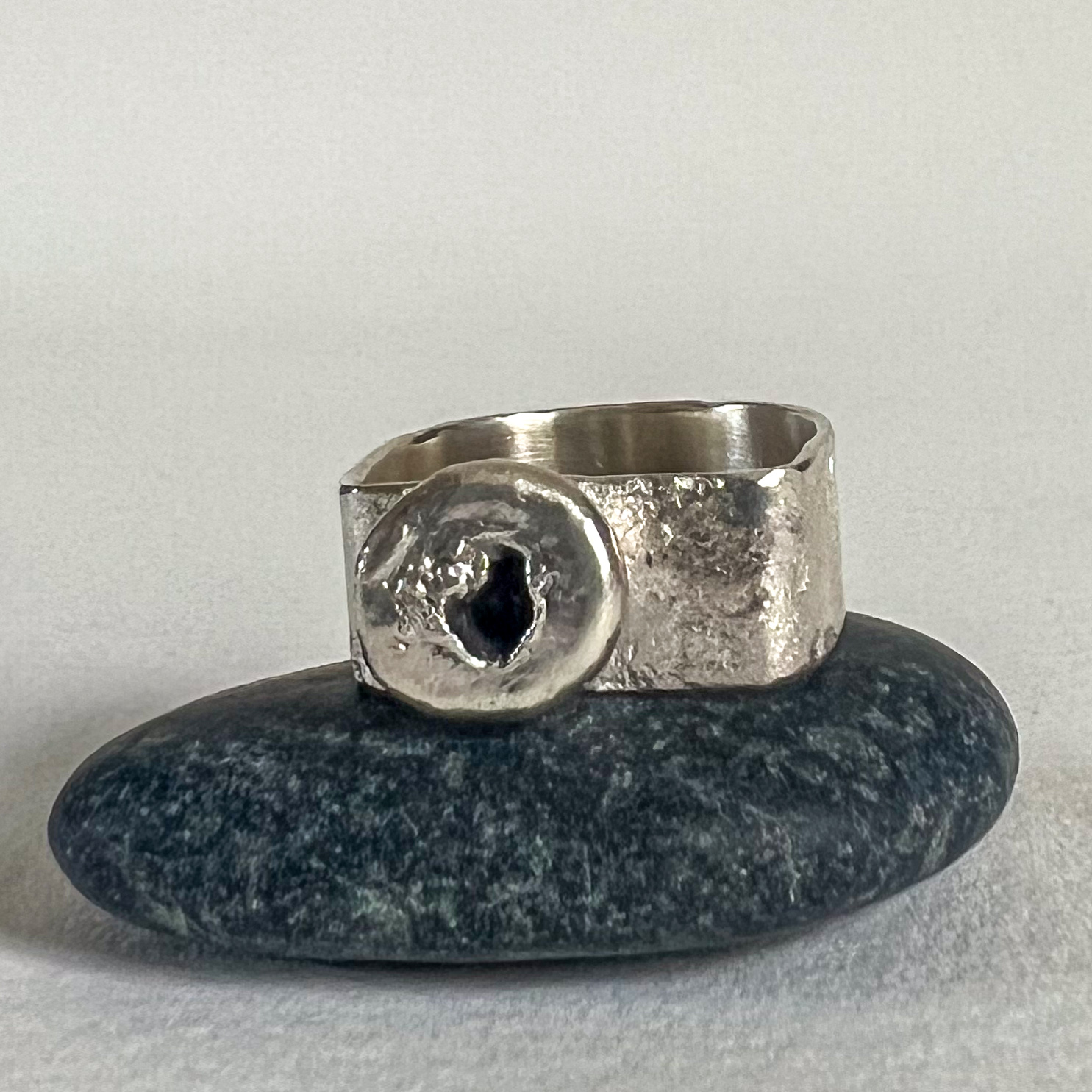 Molten silver, poured into Atlantic Ocean seawater, forms the unique salt cast cavern ring. The interior has a deep patina to highlight the depth. The band has been textured on Cornish granite to reflect the rugged nature and power of the ocean. A piece that celebrates the meeting of sea and stone — rugged, tactile, and deeply connected to the coast.